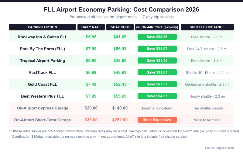 Fort Lauderdale airport parking economy is the term travelers use for the most affordable parking options at Fort Lauderdale-Hollywood International Airport (FLL) — including the on-airport Overflow Lot at $10/day and seven verified off-site lots ranging from $7.95 to $9.99/day. These economy options can save you up to 61% compared to on-airport long-term garage rates of $20/day and up to 72% vs. short-term rates of $36/day. All verified lots include a free shuttle to FLL terminals (verified April 2026).
