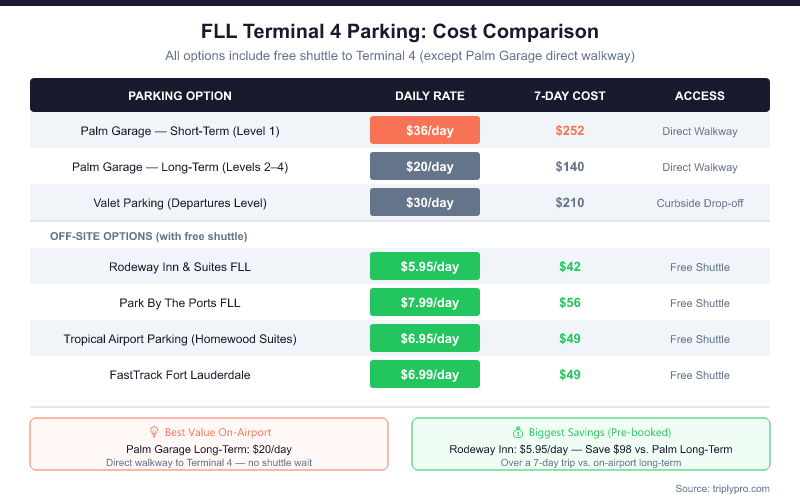 The Palm Garage is the closest parking to FLL Terminal 4, with long-term rates at $20/day. Off-site lots start at $7.95/day with free shuttle service to Concourse G.