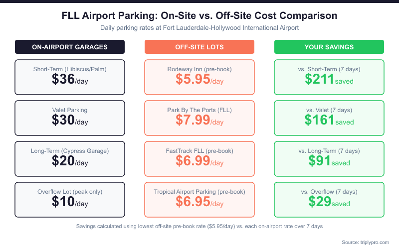 Yes — significantly. Off-site lots near FLL charge as little as $7.95/day, compared to $20/day for on-airport long-term parking. That's a savings of up to 60% for a 7-day trip. All verified off-site lots listed below include free shuttle service to FLL terminals.