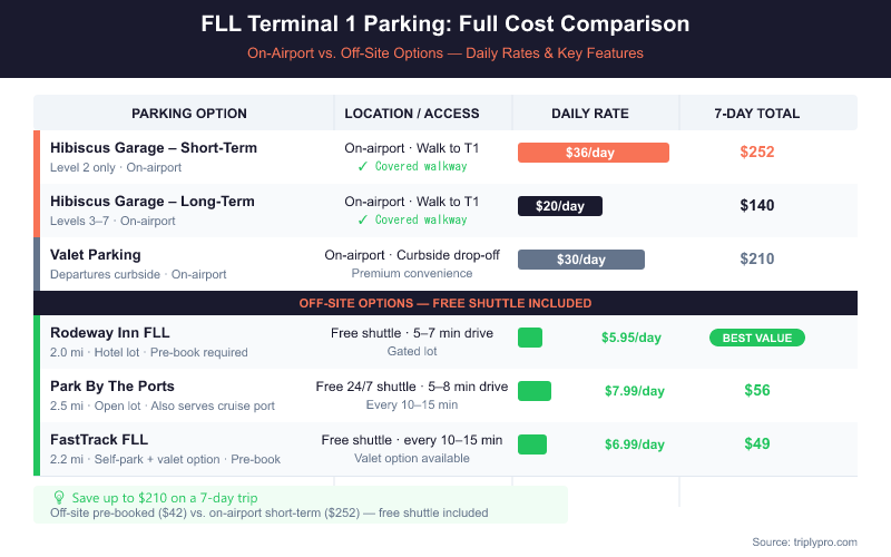 Find the best parking for FLL Terminal 1 in 2026. Hibiscus Garage starts at $20/day on-site. Off-site lots from $7.95/day with free shuttles. Full map, rates, and tips included.