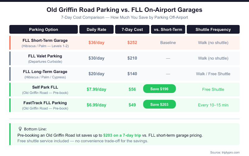 Parking on or near Old Griffin Road costs between $9.95 and $9.99/day based on current verified rates. That compares very favorably to FLL's on-airport long-term rate of $20/day and the short-term garage rate of $36/day. Over a week-long trip, the savings are significant.