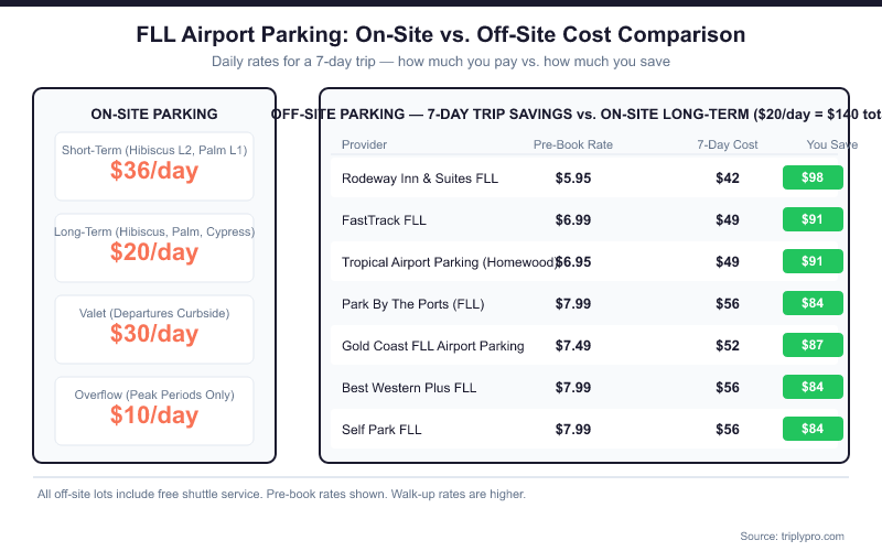 Ready to lock in your parking before your trip? Search FLL parking on Triply — compare on-site and off-site rates side by side, with off-site options from $7.95/day.