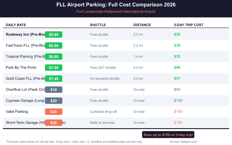 All rates verified April 2026. For a detailed breakdown of daily and extended-stay costs, see our guide on Fort Lauderdale Airport parking daily rates.