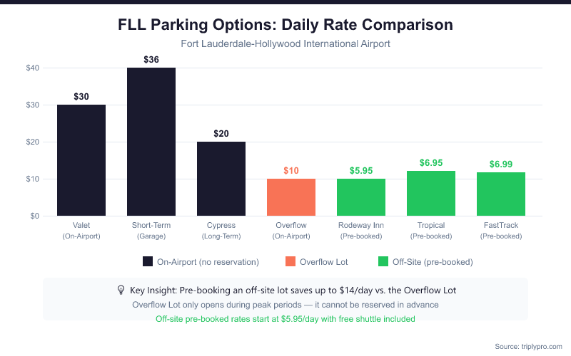If you want to lock in a guaranteed spot before you leave home, compare FLL off-airport parking rates from $7.95/day on Triply — lower than the overflow lot, with a free shuttle and confirmed reservation.