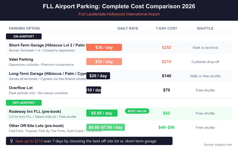 | Parking Option | Rate (per day) | Shuttle Included | Distance to FLL |