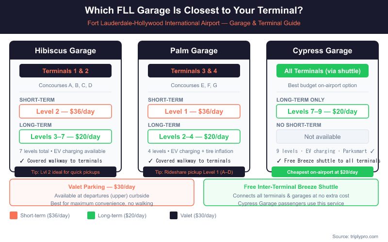 The right garage depends on which terminal your airline uses. FLL has three main parking garages, each serving different areas of the airport (per the Broward County Aviation Department).