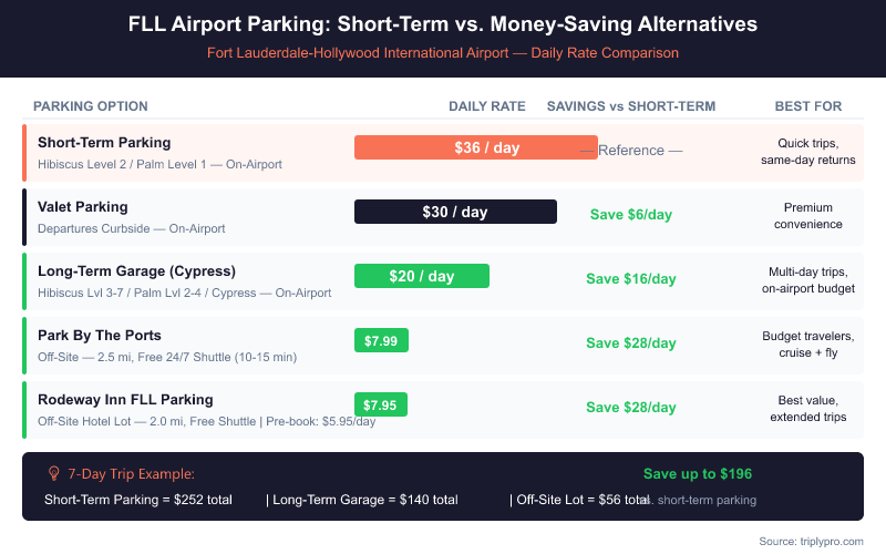 Off-site lots near FLL cost $7.95–$9.99/day — far less than the $36/day short-term garage rate. For trips under two hours, shuttle time on both ends reduces the value. For anything longer, the savings are hard to ignore.