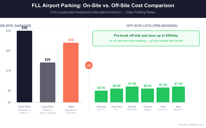 Pre-booking off-site parking through Triply's FLL parking search locks in rates from $7.95/day — saving up to 78% compared to FLL short-term garage rates. That is a significant difference for longer stays.
