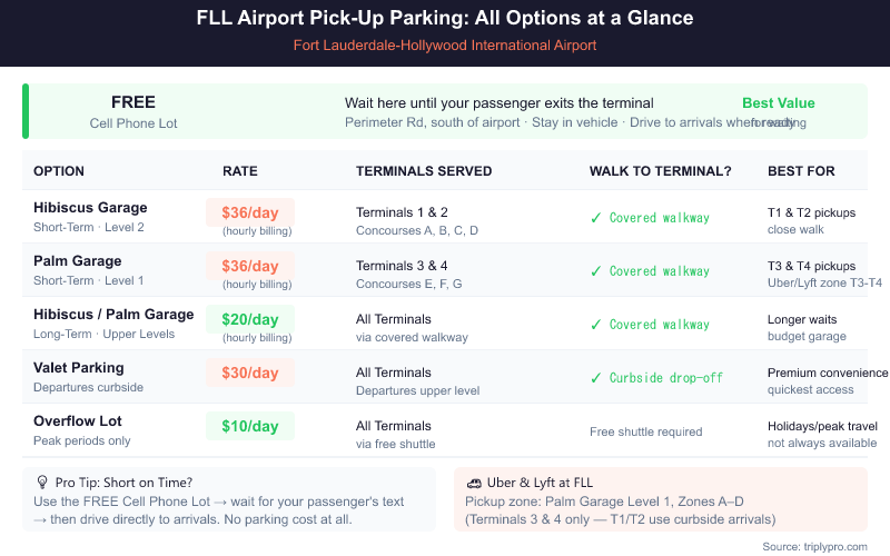 Fort Lauderdale airport pick-up parking is any paid or free waiting option that lets drivers hold near Fort Lauderdale-Hollywood International Airport (FLL) until their passenger's flight lands and they're ready at the curb. The best free option is the Cell Phone Waiting Area on Perimeter Road, south of the airport. For longer waits, the short-term garages (Hibiscus, Palm, Cypress) charge $36/day with rates billed incrementally. Valet parking runs $30/day and works well if you need a hands-free experience at the curb. Off-site lots start from $7.95/day and are a real option if you're picking up someone who was dropped off there before their trip.