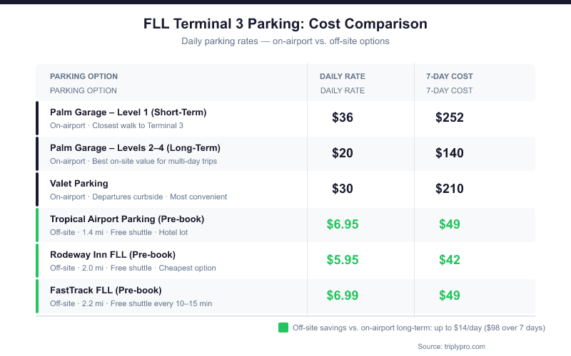 Bottom line: The Palm Garage is the closest on-site parking to FLL Terminal 3, with long-term rates at $20/day. Off-site lots start at $7.95/day with free shuttles — saving Terminal 3 travelers over $84 on a one-week trip compared to on-site long-term rates. Pre-book to lock in the best FLL Terminal 3 parking rate before peak season fills up.