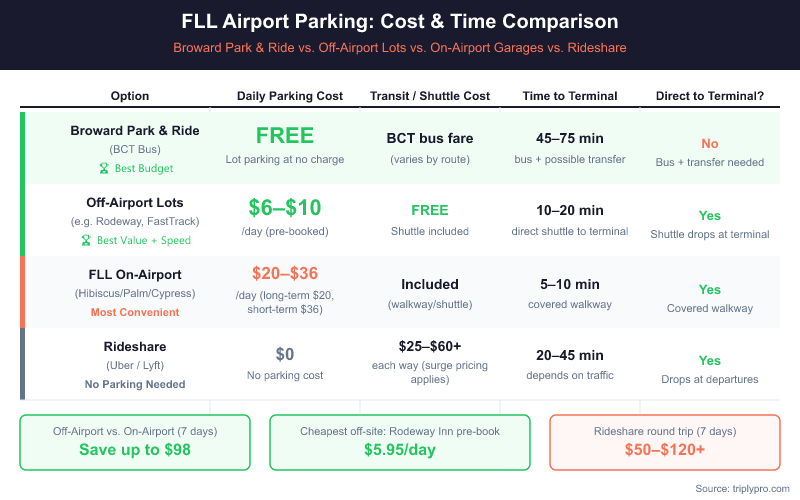 - On-airport parking comparison: FLL long-term garage parking runs $20/day; off-site lots start from $7.95/day — both include direct shuttle service to terminals.