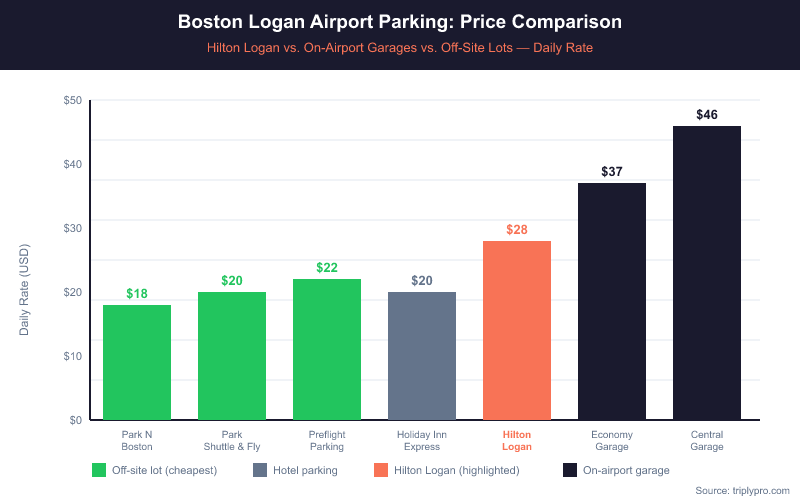 - On-airport comparison: Logan's Economy Parking Garage costs $37/day — Hilton parking is cheaper by $9/day