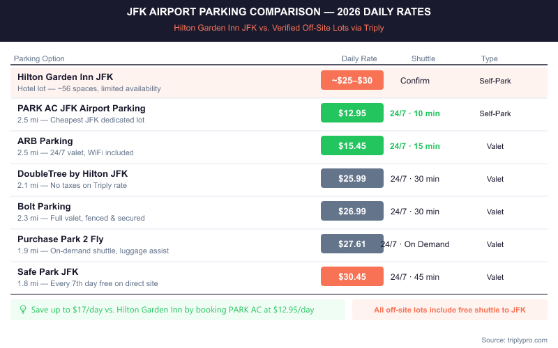 For context, here's how Hilton Garden Inn JFK parking compares to verified off-site lots near the airport (as of 2026):
