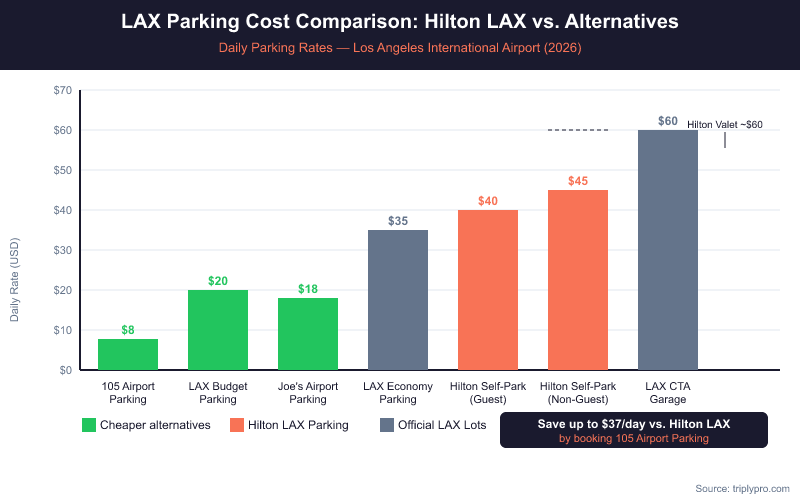 The Hilton LAX charges separately for parking and hotel stays. Non-guests pay a standard daily rate without any room discount applied. Based on current hotel parking rates in the LAX Century Boulevard corridor, here is what travelers should budget (verified April 2026):