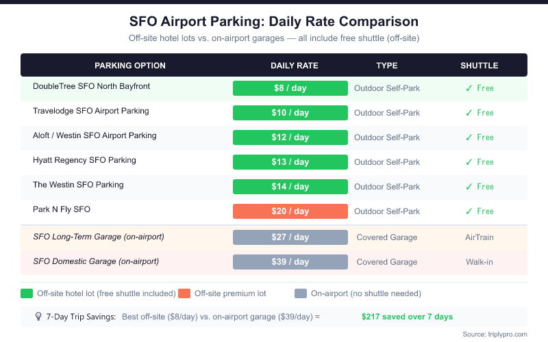 Based on current rates, the cheapest verified option near the Hilton SFO area is DoubleTree SFO North Bayfront at $8/day — saving you up to 79% versus the on-airport Domestic Garage. Even the mid-range hotel lots at $12-$14/day beat on-site prices by more than half. For a full breakdown of all SFO parking costs, see our San Francisco Airport Parking Cost: 2026 Full Breakdown.
