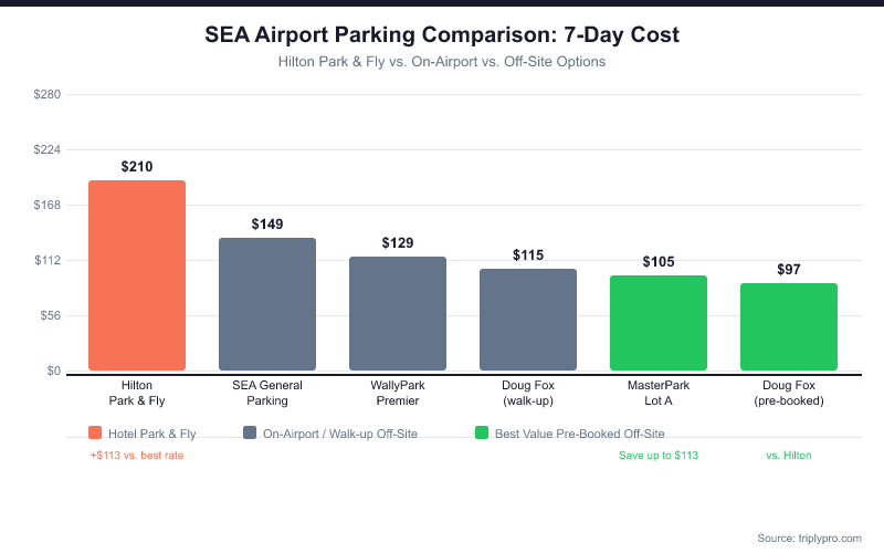 Here's how the Hilton stacks up against on-airport and verified off-site options near SEA for a 7-day trip (parking only, no hotel room factored in for off-site lots):
