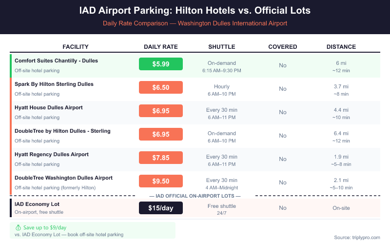 The bottom line: if your flight is during normal hours and you want to save money, a Hilton-brand hotel lot beats every on-airport option on price. If you need covered parking or a 24/7 shuttle, stick with IAD's Economy Lot or the garages.