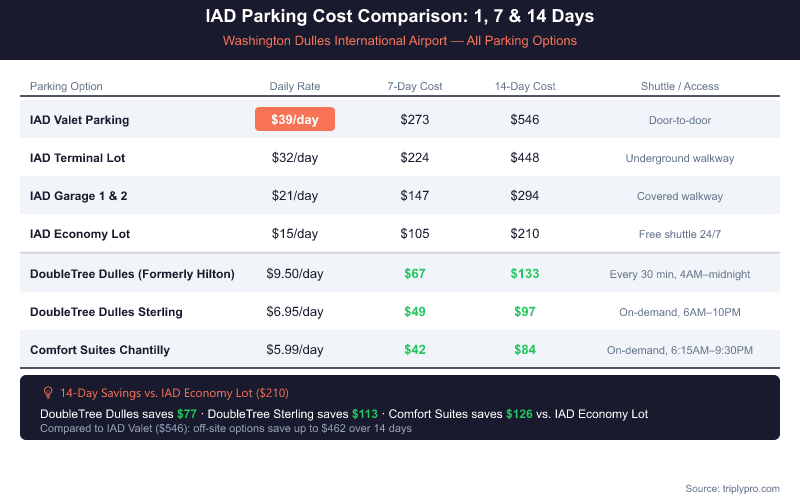 If you're deciding between on-airport and hotel lots, also check our breakdown of Dulles Airport park and fly hotel deals for a full comparison across all hotel brands near IAD.