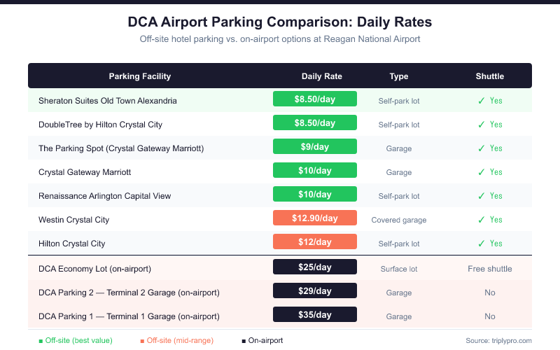 Off-site hotel parking near DCA is consistently cheaper than any on-airport option. The gap is especially large for trips of 3 days or more.