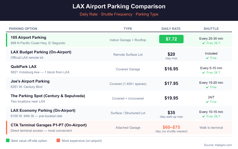 Ready to find the best LAX parking rate for your trip? Compare all LAX airport parking options on Triply — off-site lots start at $7.72/day, with free shuttles to every terminal.