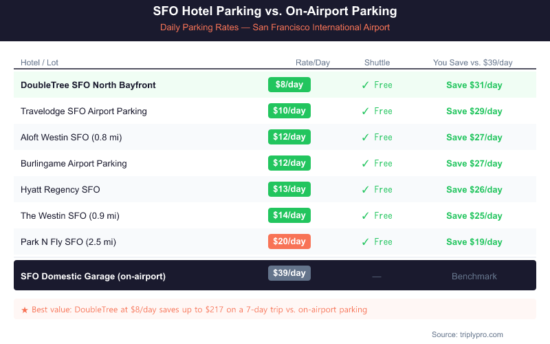 - Lowest parking rate: DoubleTree SFO North Bayfront at $8/day — the most affordable hotel parking near SFO