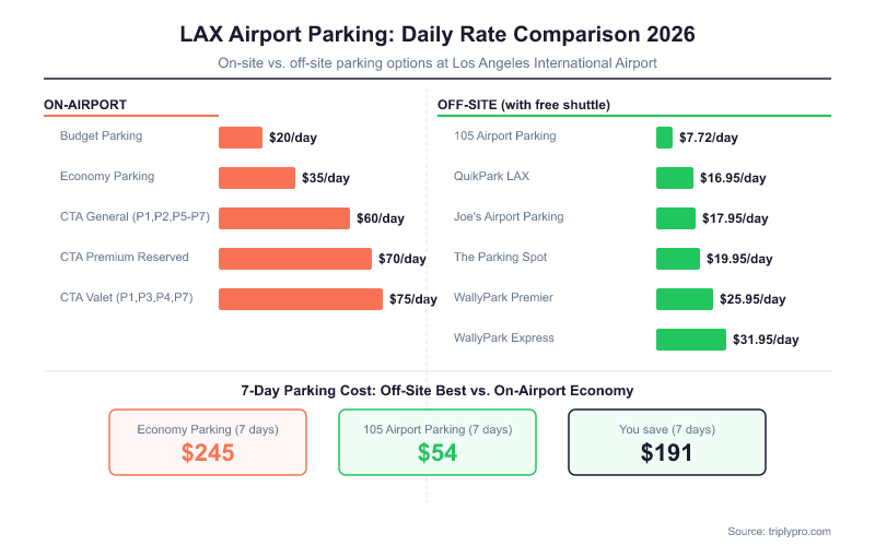 Ready to book? Compare all LAX parking options on Triply — off-site lots from $7.72/day with free cancellation. Find the lowest rate for your exact travel dates before prices go up.