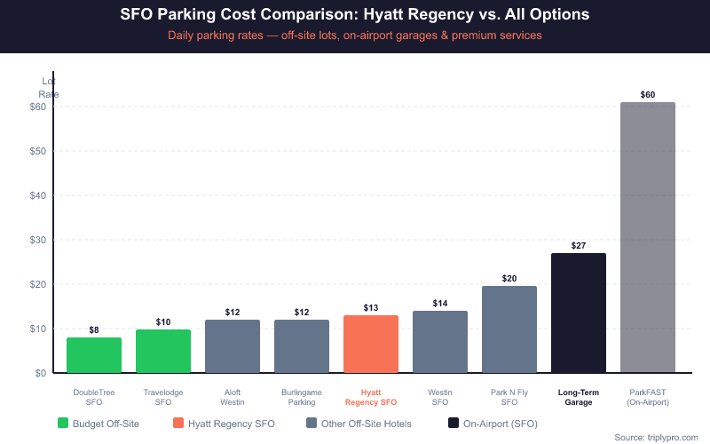 The Hyatt SFO parking lot at $13/day is significantly cheaper than every on-airport option at San Francisco International Airport. Here's a direct comparison: