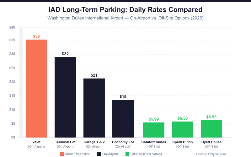 IAD airport long term parking rates range from $15/day at the on-airport Economy Lot to $39/day for Valet. Off-site lots near Dulles start as low as $5.99/day. Compare every option.