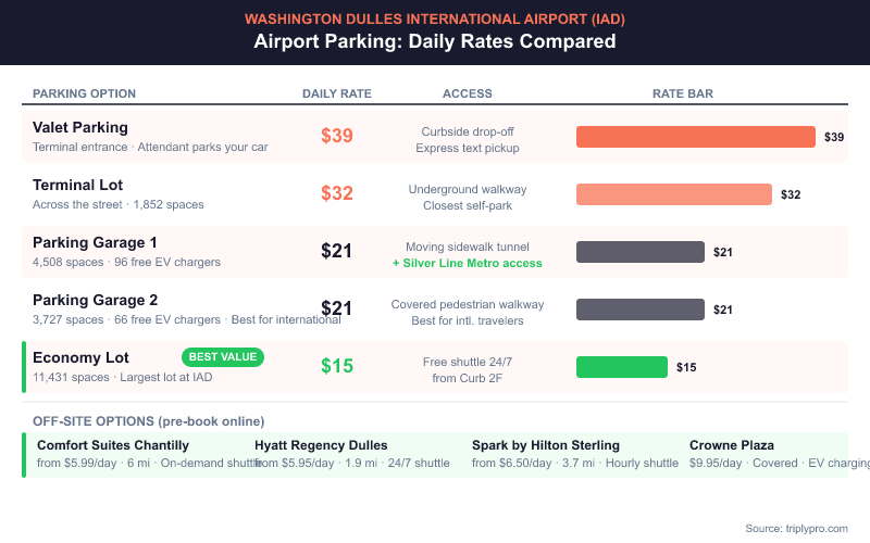 Here is every parking option at and near Dulles, with rates verified April 2026: