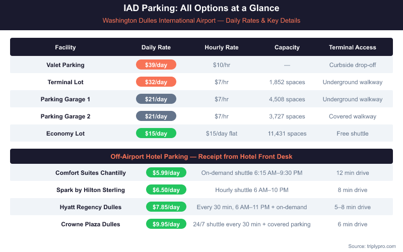 Planning your trip? Compare IAD parking rates from $5.99/day on Triply — including off-airport hotel lots with free shuttles — before you book.