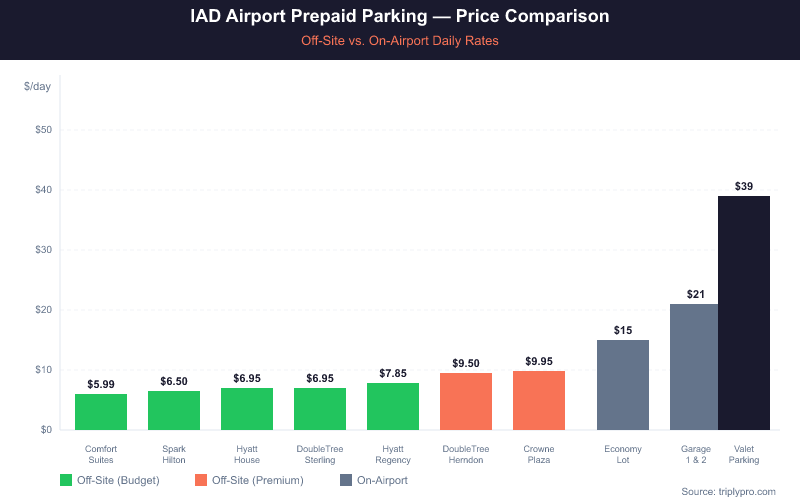 The cheapest prepaid off-site option (Comfort Suites Chantilly at $5.99/day) saves you $9/day versus the Economy Lot and $15/day versus Garage 1. Over a 7-day trip, that's a saving of up to $105 compared to on-airport garage parking. For a full breakdown of every on-airport rate, see our Dulles Airport parking rates comparison.
