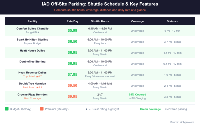 The seven verified prepaid lots near IAD are all hotel-based, meaning your car parks in a secure hotel lot and a free shuttle takes you to the terminal. Each lot has different shuttle windows — a critical detail for early-morning or late-night flights.