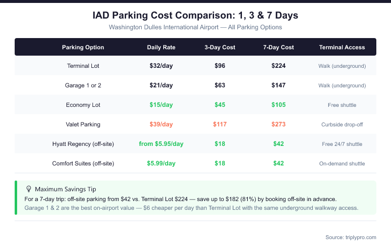 - Terminal Lot rate: $7/hour, max $32/day — the closest self-park lot at IAD