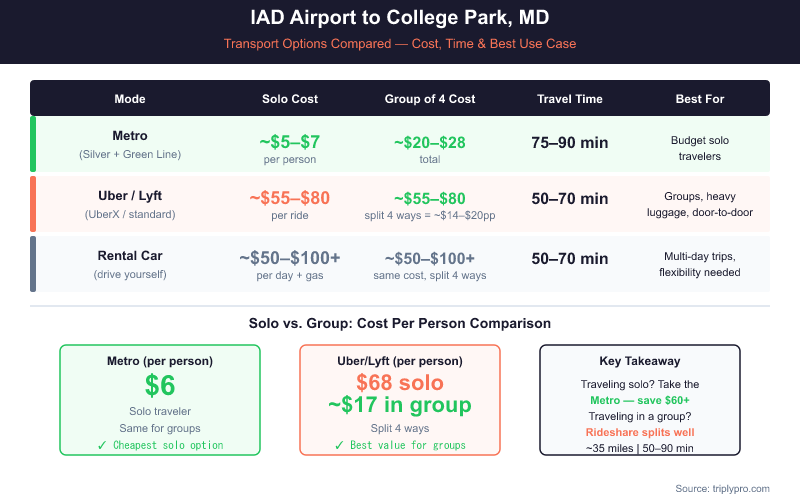 The Metro is the cheapest single option for solo travelers. A SmarTrip card fare from Washington Dulles International Airport station to College Park–University of Maryland station runs approximately $5.00–$7.25 depending on peak vs. off-peak travel (verified April 2026). Cash fares on WMATA are higher — always load a SmarTrip card to pay the reduced rate.