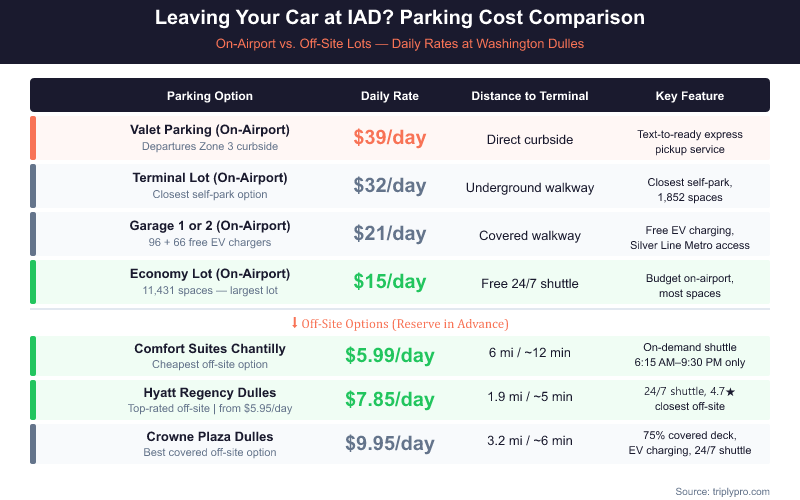 If you're driving yourself and need to park at IAD, that changes the math significantly. Long-term parking at Dulles runs $15/day at the Economy Lot up to $39/day for Valet. For a week-long trip, you're looking at $105–$273 in parking on top of your transport costs. Off-site hotel lots cut that to $41.93–$69.65 for 7 days at the cheapest verified options. Our guide to long-term Dulles Airport parking rates and best lots covers this in detail if you're leaving a car at IAD.