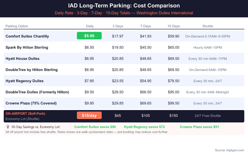 - Book off-airport early. The cheapest lots — like Comfort Suites Chantilly at $5.99/day — sell out for peak travel dates. Locking in a rate two to four weeks ahead protects both price and availability.