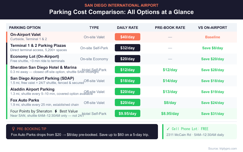 Off-site parking lots near San Diego International Airport start at $8.95/day when pre-booked — more than 70% cheaper than the $32/day on-airport parking plazas. All major off-site operators include a free shuttle to both terminals. Here are the verified options sorted by price: