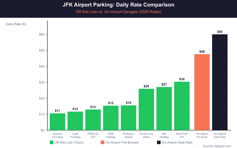 Daily rates at Jamaica Center and nearby off-site JFK lots range from $10.62 to $30.45/day, based on current Triply data (as of 2026). On-airport Yellow and Blue Garages charge up to $80/day at the gate, per JFK's official parking page. Pre-booking on-airport drops that to $48/day — still well above the best off-site options.