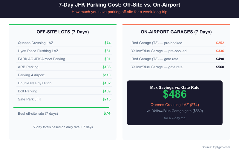 For a 7-day trip, parking at PARK AC JFK Airport Parking costs around $90.65 total. The same week at the Yellow Garage gate rate costs $560. That's a savings of nearly $470 on a single trip. Pre-booking the Yellow Garage at $48/day adds up to $336/week — still more than three times the best off-site rate.