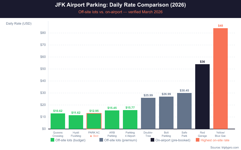 - Cheapest off-site option: PARK AC JFK Airport Parking at $12.95/day with 24/7 shuttles every 10 minutes.
