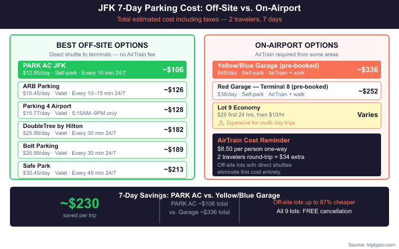 Based on current rates, off-site extended parking starting at $12.95/day is your best bet for multi-day trips. Compare JFK extended parking deals on Triply — lots start under $13/day.