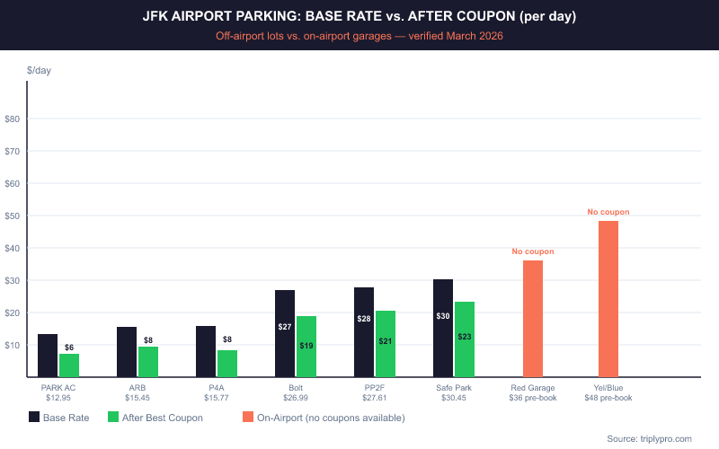 Off-airport lots with a coupon can bring your rate to under $10/day at the cheapest options. Even premium off-airport lots like Bolt Parking ($26.99 base) drop to about $19/day with the JFK319 code — still cheaper than the on-airport minimum.