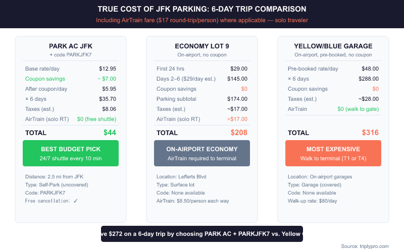 For a 5-day trip, using code PARKJFK7 at PARK AC saves $7 upfront — $64.75 total versus $240 at the Yellow Garage. Search JFK off-airport lots under $10/day after coupons on Triply.
