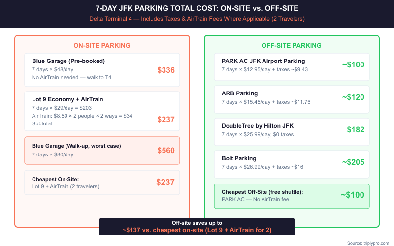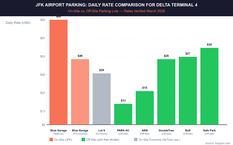 Parking costs at JFK vary widely depending on whether you park on-site or off-site. Here's a clear breakdown of your main options as a Delta traveler using Terminal 4 (rates verified March 2026).