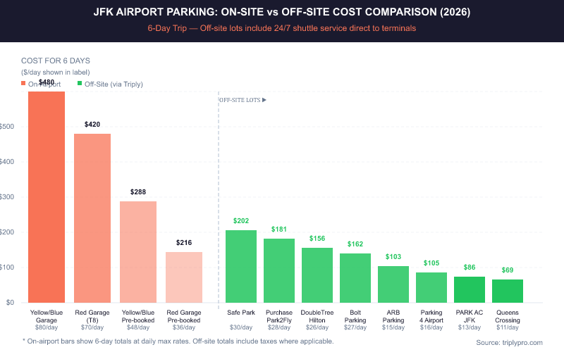 According to the JFK official parking page, on-airport Yellow and Blue Garages charge up to $80/day walk-up, or $48/day pre-booked. The Red Garage near Terminal 8 costs up to $70/day walk-up, or $36/day pre-booked. Off-site lots via Triply start at $10.62/day — over 85% less than the on-airport walk-up rate (as of 2026).