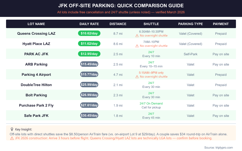 - Real JFK parking: Off-site lots via Triply start at $10.62/day, versus up to $80/day at on-airport garages (as of 2026).