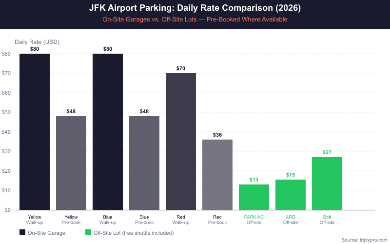 Parking costs at JFK vary widely based on location, duration, and whether you book ahead. The table below shows current rates across on-site garages and popular off-site lots (as of 2026).
