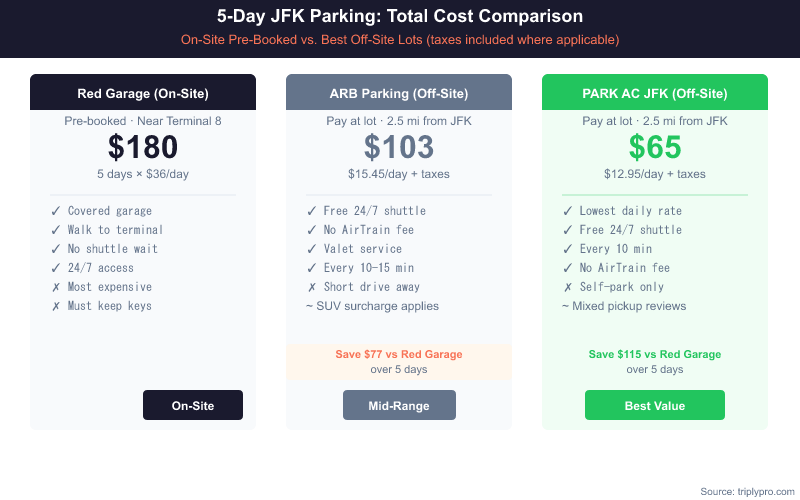 The math is straightforward for longer trips. A 5-day stay in the Red Garage (pre-booked) costs $180. The same stay at PARK AC JFK Airport Parking costs around $65 — a savings of over $115. Off-site lots also save you the $8.50 AirTrain fee per person that Lot 9 users pay.