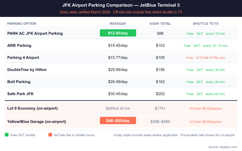 Off-site parking is almost always cheaper for JetBlue travelers at Terminal 5. Here's a simple cost comparison based on verified March 2026 rates: