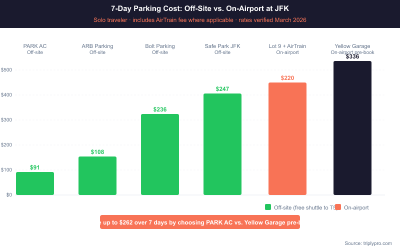 Over a 7-day trip, the savings are substantial. Off-site at PARK AC costs roughly $91 total. On-airport pre-booked runs $336+ before AirTrain fees. That's a difference of $245 or more for a solo traveler.